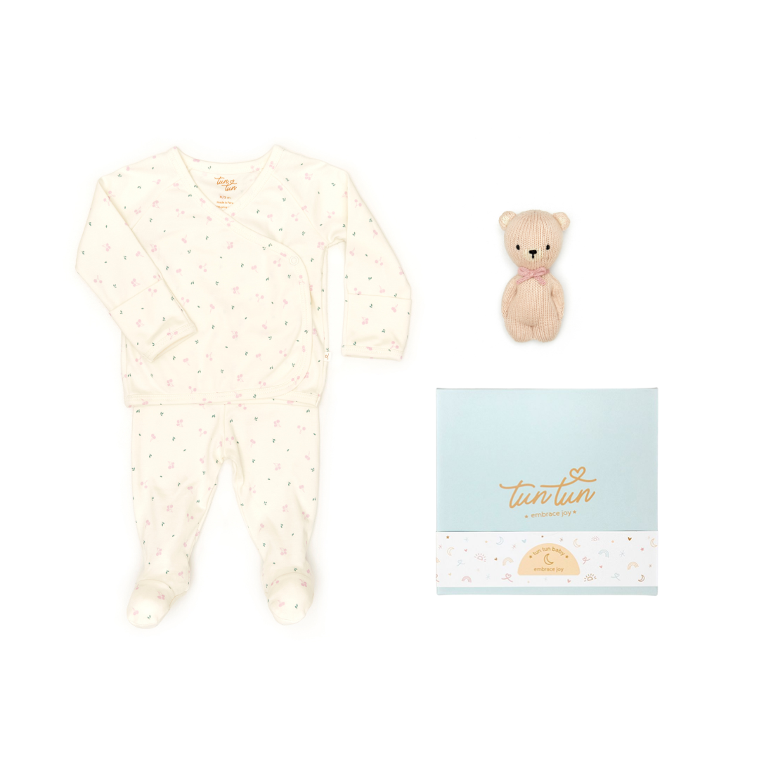 AJUAR KIMONO DE ALGODÓN PIMA CEREZA + OSITO SONAJA + CAJITA DE REGALO