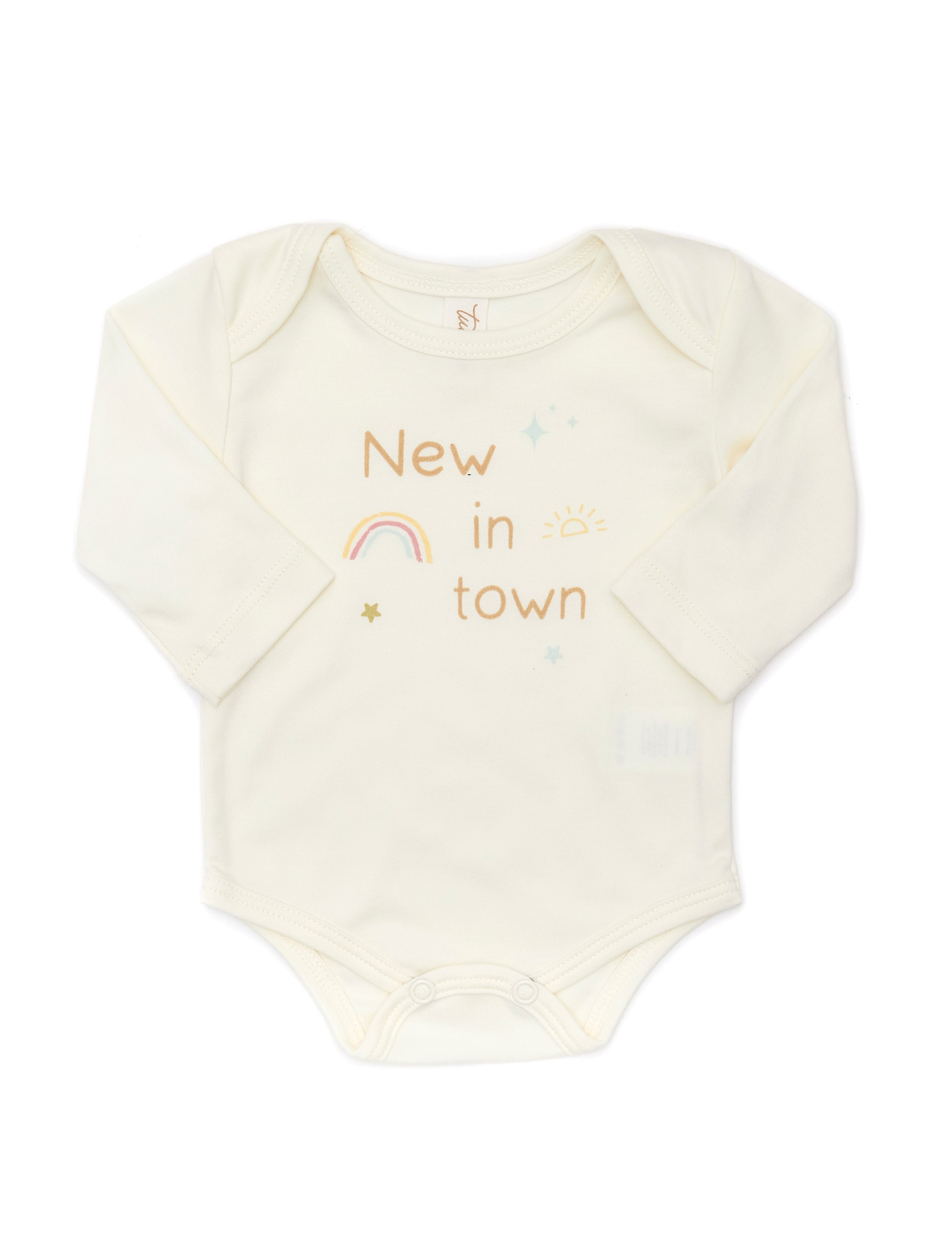 El estampado "New in Town", acompañado de un arcoíris y un sol radiante, añade un toque de ternura que derretirá corazones. Este body no solo es una prenda, sino una bienvenida cálida y amorosa para los nuevos integrantes de la familia.